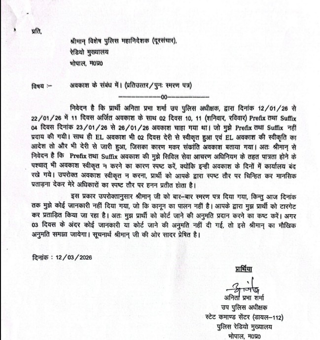 DSP अनिता प्रभा शर्मा ने जनवरी 2026 में Prefix और Suffix के साथ अवकाश के लिए आवेदन किया था. नियमों के अनुसार उन्हें यह छुट्टी मिलनी चाहिए थी, लेकिन आरोप है कि उनकी छुट्टी बिना किसी स्पष्ट कारण के रोक दी गई. इतना ही नहीं, EL अवकाश की स्वीकृति भी देर से दी गई. जिससे यह सवाल उठता है कि क्या प्रशासनिक नियमों का पालन सभी अधिकारियों के लिए समान रूप से किया जा रहा है या नहीं.